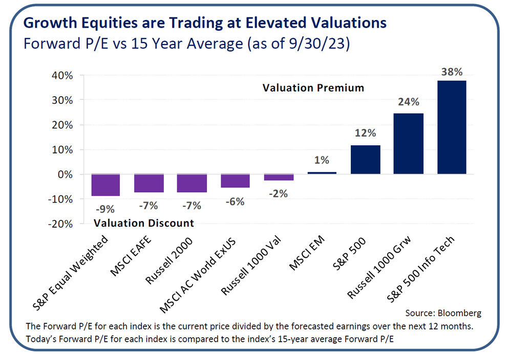 In our view, instead of chasing the return drivers of early 2023, investors should remain diversified and ensure appropriate allocations to a variety of other asset classes with lower correlations to growth equity. Within equity markets, large cap value and smaller market cap stocks have the potential to provide attractive risk/return profiles at more reasonable valuations. Equity risk should be appropriately balanced with meaningful allocations to core fixed income and diversifying strategies that look increasingly attractive in today’s economic and interest rate environment. Many investors have been sitting on excess cash reserves given the high short-term rates, but there is an opportunity cost to sitting on the sidelines and capital appreciation may be missed if markets move quickly.