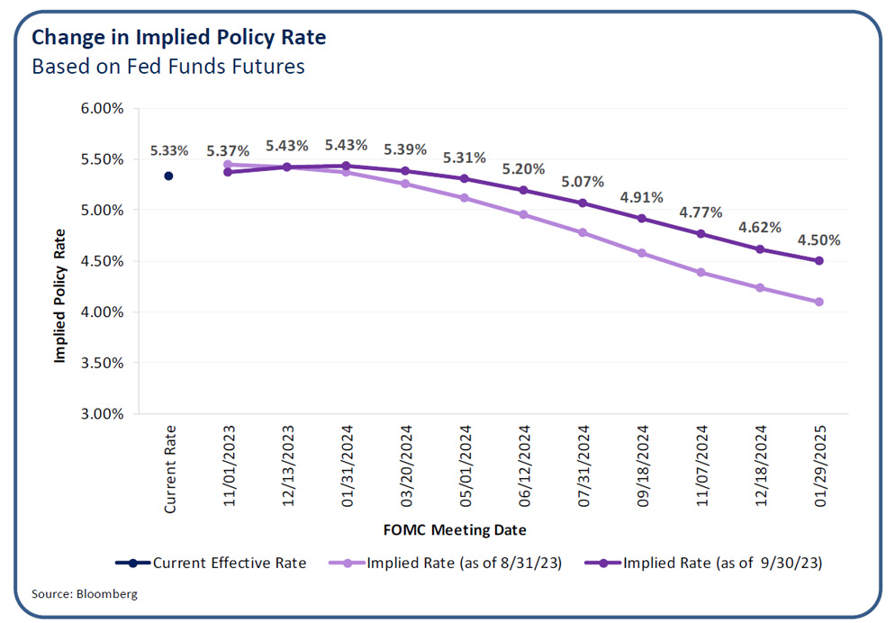 Domestic growth has been much more resilient than expected, and the Atlanta Fed GDPNow model is forecasting a well above-trend annualized growth rate for the third quarter. The continued strength of the U.S. consumer has propelled much of the growth, as low unemployment, wage gains and excess savings helped to sustain spending habits even as prices continued to rise. With inflation prints continuing to trend lower over the summer, many investors began to buy into the soft landing or even no landing narratives.